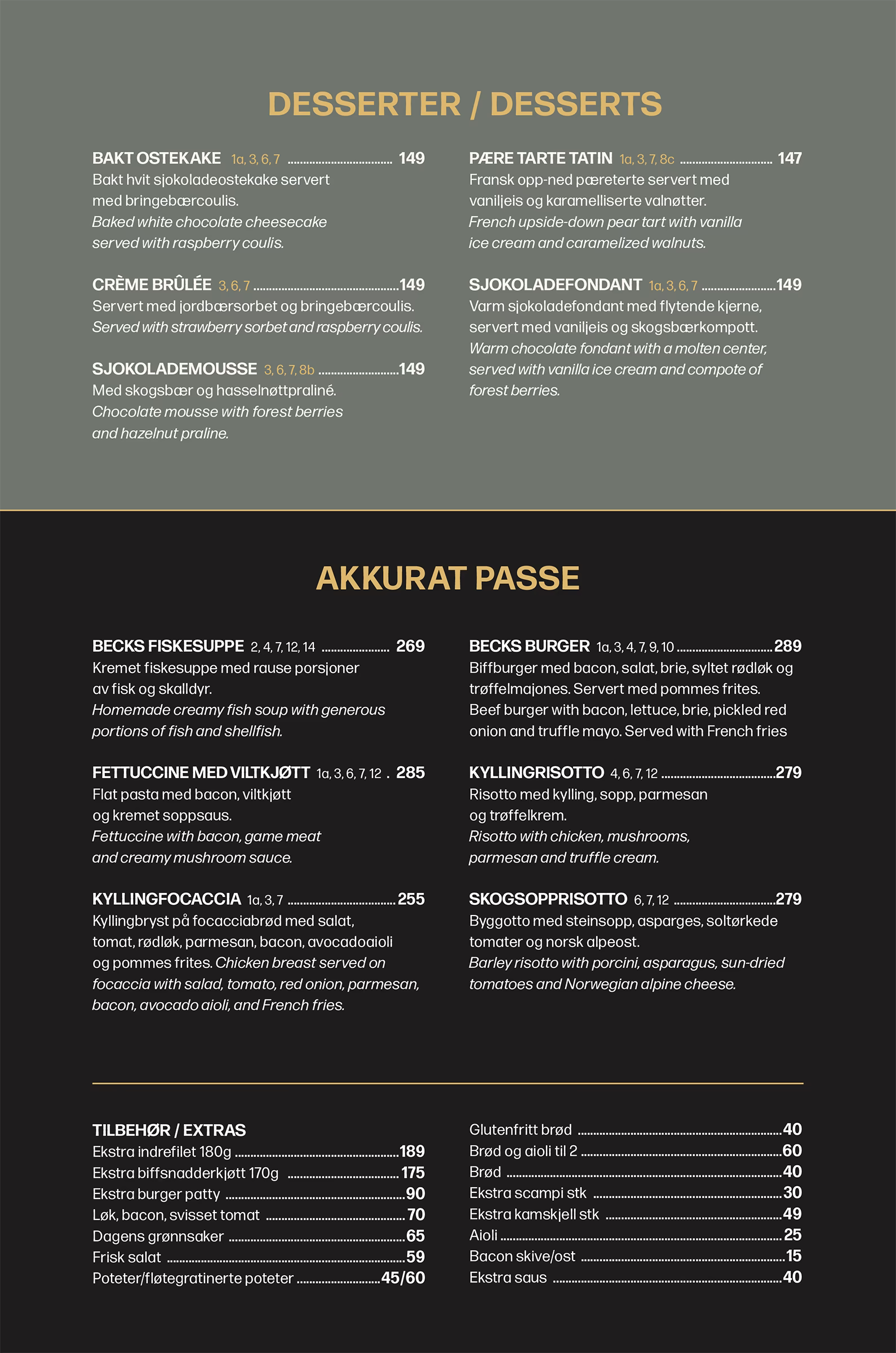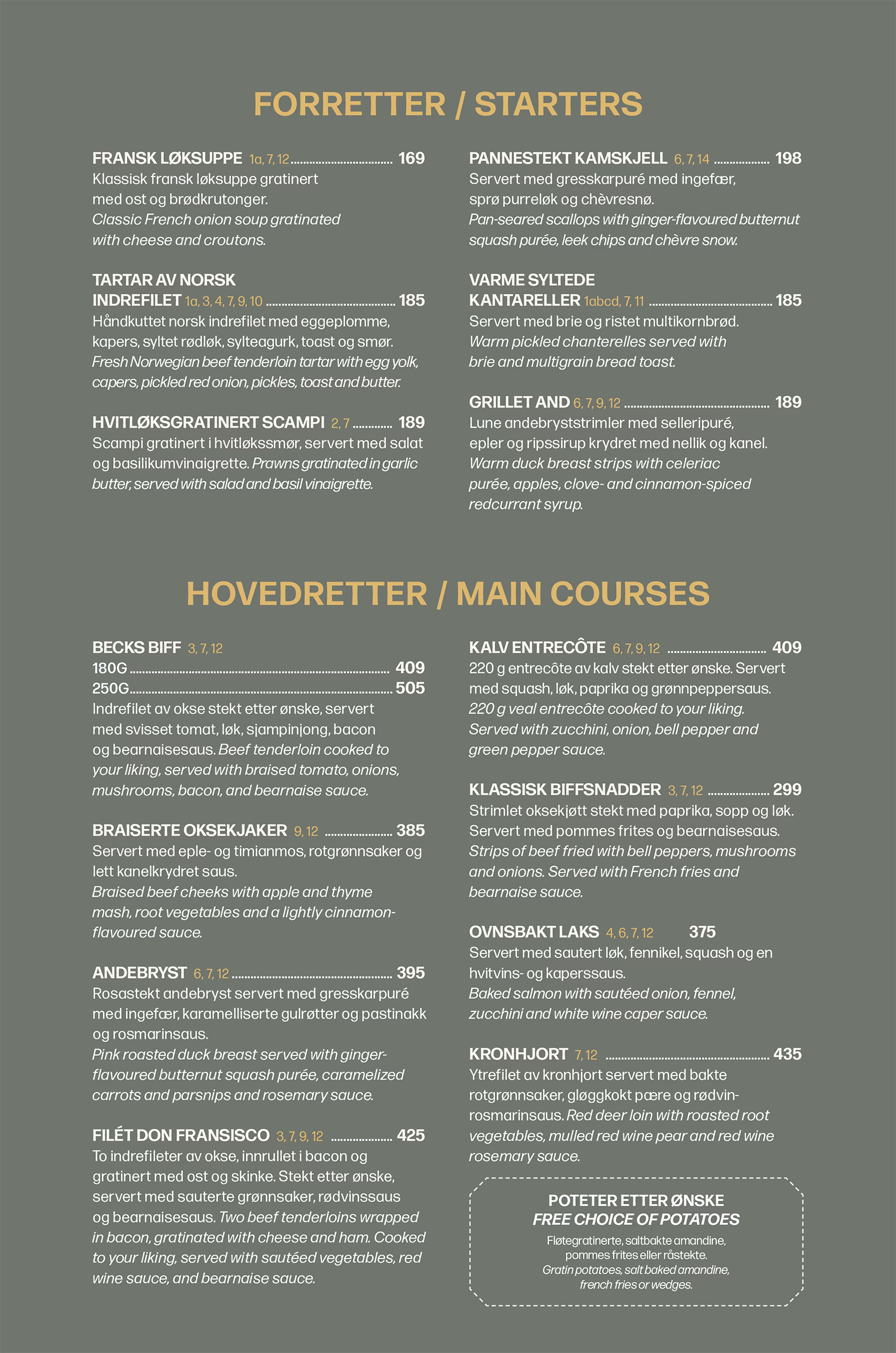 Kr 425,-To indrefileter av okse, innrullet i bacon og gratinert med ost og skinke. Stekt etter ønske, servert med sauterte grønnsaker, rødvinssaus og bearnaisesaus. Two beef tenderloins wrapped in bacon, gratinated with cheese and ham. Cooked to your liking, served with sautéed vegetables, red wine sauce, and bearnaise sauce.